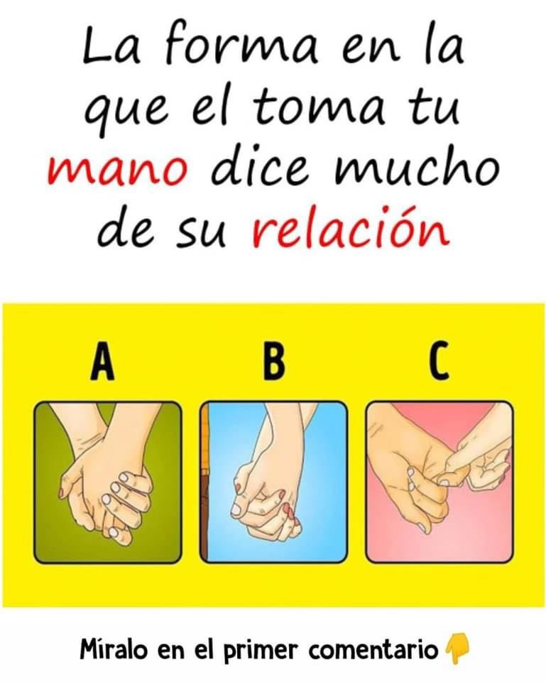 Lo que significa cuando toma tu mano sin entrelazar dedos y dejando su mano sobre la tuya Comentan que cuando se tiene la palma de la mano hacia abajo (arriba de la otra) es la persona que comúnmente toma un papel más dominante en la relación.