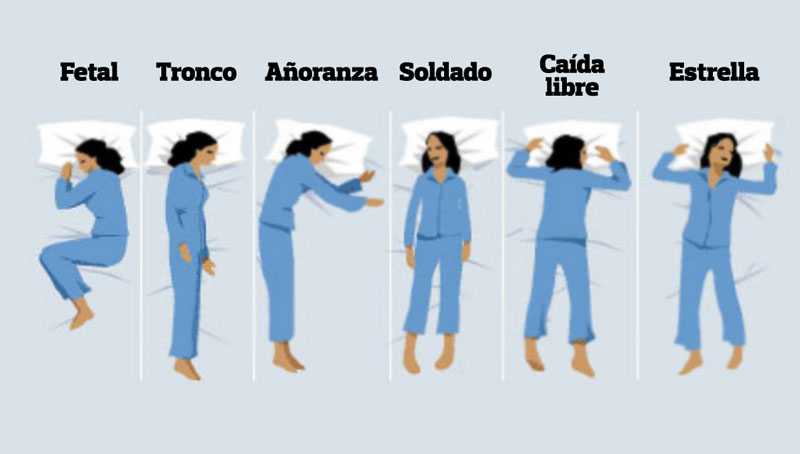 6- Posición ‘caída libre’: boca abajo y la menos aconsejable por los profesionales dado que, aunque hay estudios que hablan de ella bien para una precisa digestión, los órganos acostumbran estar sometidos a más grande presión que en las anteriores y no se respira de manera precisa. Los que eligen por ella tienden a ser personas muy sociables, fanáticos de la independencia, sensibles e profundas.