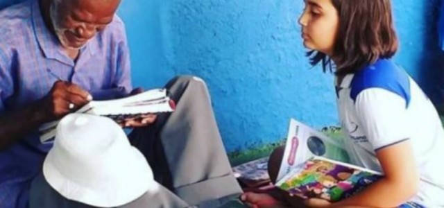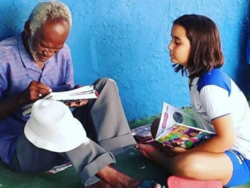 Todos lo días, cuando termina sus clases, la niña se queda en la puerta del colegio y le enseña a leer y a escribir. El hombre trabaja hace más de 40 años vendiendo helados frente a su escuela en la localidad de Crato, Brasil.
