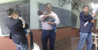 Un profesor cuida del bebé de una de sus alumnas para que ella pueda tomar su clase